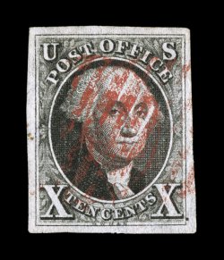 11 O 2 2, 10c Black, used, large margins all around, strong color and impression, red grid cancel, two light horizontal creases, extremely fine appearance.#2, 10c Black, used, large margins all around, strong color and impression, red grid cancel, two light horizontal creases, extremely fine appearance. (Image) $1,400.00