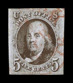 certificate.#1, 5c Red brown, used, four full to very large margins, rich bright color and a clean impression, unusually light red grid cancel, choice very fine; 1994 PSE certificate. (Image) $600.00