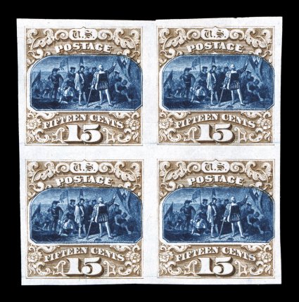 toned spot, still very fine-extremely fine a scarce position block.#122-E2b, 90c Dull violet plate essay on stamp paper, bottom sheet-margin imprint block of four, other margins very large as well, quite fresh, bottom right stamp with trivial toned spot, still very fine-extremely fine; a scarce position block. (Image) $1,100.00