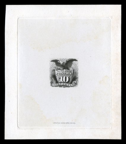 front, but actually it is quite fresh overall, very fine a rarely#116TC1, 10c Black, large die trial color proof on India, die sunk on 79x92mm card, with National Bank Note Co. imprint at bottom, there is just the slightest bit of aging on the front, but actually it is quite fresh overall, very fine; a rarely offered 1869 Pictorial trial color proof. (Image) $2,500.00