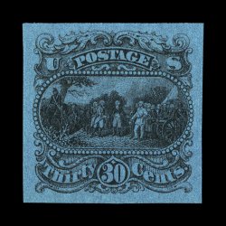 colors, very fine-extremely fine.#121-E1p, 30c Burgoyne black plate essay on thin surface tinted paper, four different colors, Salmon red, Yellow, Blue and Pale green, each with large margins all around, strong colors, very fine-extremely fine. (Image) $900.00