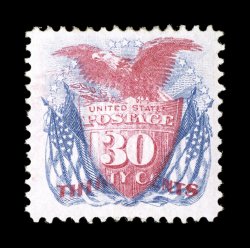 this scarce mint stamp 1986 PF certificate.#121, 30c Blue and carmine, lovely centering within extra-large margins, exceptionally bright and fresh, full o.g., relatively lightly hinged, a very fine and choice example of this scarce mint stamp; 1986 PF certificate. (Image) $8,000.00