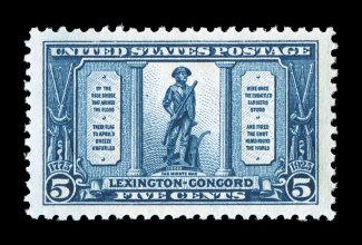 $275.00).#619, 5c Lexington-Concord, exceptionally well centered within large margins, strong rich color, o.g., n.h., extremely fine; 2007 PSE certificate (XF-Superb 95; SMQ $275.00). (Image) $35.00