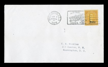 698 FDC 669-79 669-79, 1c-10c Nebr. ovpts. cplt. set on one first day cover, tied by Washington, D.C., May 1, 1929 duplexes on Ward addressed cover, Air Mail and Special Delivery handstamps,