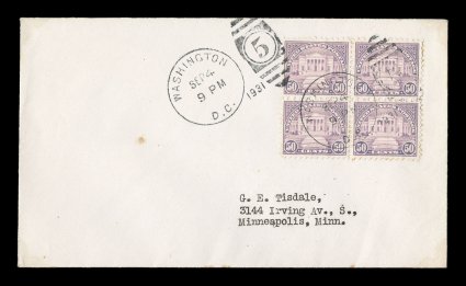 generally well centered and fresh, some covers with tiny bits of age s#692-701, 11c-50c Rotary press printing cplt., block of four of each tied by Washington, D.C. duplex first day covers, all addressed to G.E. Tisdale of Minneapolis, stamps are generally well centered and fresh, some covers with tiny bits of age spots (often from corner mounts), otherwise very fine; an especially scarce set in block of four. (Image) $4,365.00