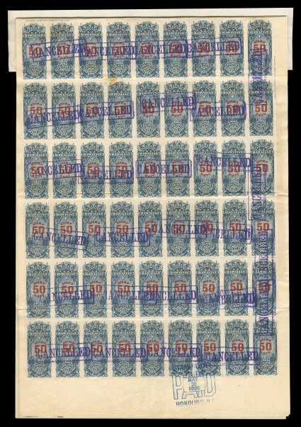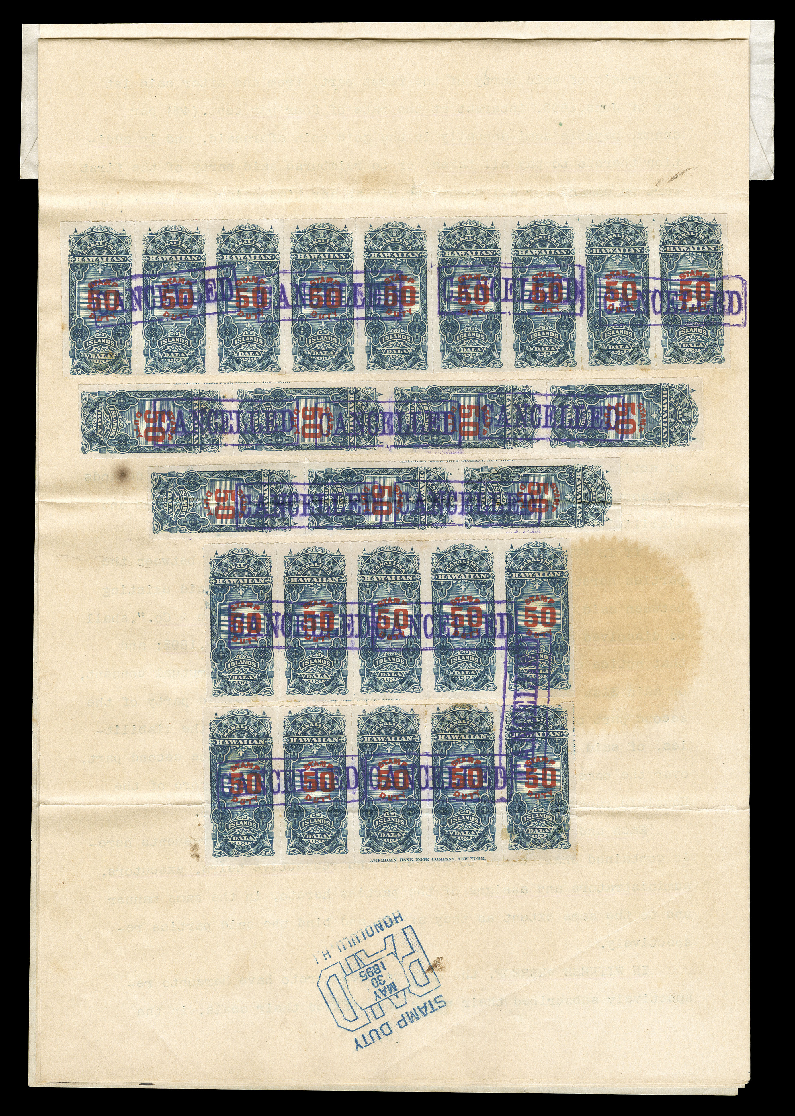 Damon for Damon to buy the interest of the partnership that existedCharles R. Bishop and Samuel M. Damon 1895 important and unique document signed for the sale of the banking business of Bishop & Co, an agreement between Charles Bishop and S.M. Damon for Damon to buy the interest of the partnership that existed between them known as Bishop & Co., the sales price was $800,000.00 to Bishop from Damon, the stamp duty tax due on this transaction was $4,000.00 at the rate of $5.00 for each $1,000.00 of sales price, for the payment of this a total of 80 of the scarce $50.00 Slate blue and carmine revenue stamps (#R6) were applied in the form of strips of three, four, two strips of five and a strip of nine, plus a block of 54 (9x6), these were applied to the reverse of two pages of the agreement, stamps are cancelled with boxed violet "Cancelled" handstamps, the block is tied by "Paid/Honolulu, H I/May 30 1895" handstamp, normal document folds lightly affect three of the six rows in the block, the strip of three and one strip of five, the document is dated April 4, 1895 and executed in San Francisco, California, signed "Chas. R. Bishop" and "S.M. Damon" and witnessed by J.F. Soper, the Vice and Deputy Hawaiian Consul-General in San Francisco with lovely embossed arms of the Hawaiian Consul-General on red adhesive seal, very fine.Charles Bishop and Samuel Damon were partners in the banking company of Bishop & Co. which became First Hawaiian Bank in Honolulu. The purpose of the transaction was for Charles Bishop to sell his interest as a partner in the bank to his partner Mr. Damon. The partnership was being dissolved in conjunction with this purchase and three auxiliary documents are present including a June 1, 1895 dissolution of partnership and a similar previous 1892 document for the dissolution of a partnership between Charles Bishop, Samuel Damon and John H. Paty doing business as Bishop & Co. This, in effect, was the formation of the co-partnership of Charles Bishop and Samuel Damon doing business by the same name that was now being sold. All have the appropriate signatures of the principals involved. Also includes a legal opinion by attorney Francis Hatch that the $4,000.00 Stamp Duty was applicable, though more excessive than the law had contemplated, and that there might be ways to structure it to reduce the amount but that he recommended for clear bill of sale that the tax be paid.This sale agreement is the largest financial transaction in nineteenth century Hawaii. The resulting document with the payment of $4,000.00 Stamp Duty is the largest amount of Hawaiian revenue stamps to be affixed to any document. Furthermore the block of 54 of the $50.00 Slate blue and carmine is the largest known used multiple of this scarce revenue of which only 3,500 stamps were issued. A marvelous revenue document of great rarity and incredible historical importance. (imagea) (Image) Est. $40,000-50,000
