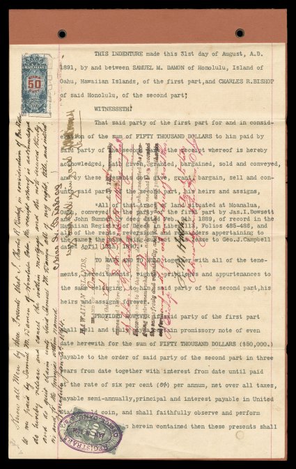 Moanalua, $50.00 Slate blue and carmine revenue (R6) centered to the left shSamuel Mills Damon and Harriet Damon 1891 document signed, English language mortgage for $50,000.00 instituted by S.M. Damon to Charles R. Bishop for a piece of land in Moanalua, $50.00 Slate blue and carmine revenue (#R6) centered to the left showing a portion of the American Bank Note Co. imprint at right, tied by "Paid" handstamp, dated August 31, 1891 and signed by "S.M. Damon" and his wife "Hattie M. Damon", the mortgage was for three years and in 1894 the mortgage was cancelled by Bishop and the land deeded to Damon for the sum of $1.00, signed for Charles Bishop by his attorney, additional $1.00 Black (#R3) for registry fee tied by the registrar's office handstamp, very fine. (Image) Est. $500-750