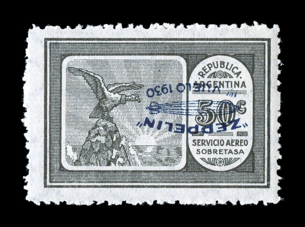 were printed 1P signed Kessler and Sanabria, in addition both are ac#C21a, C22a, 1930 50c and 1P Zeppelins with inverted overprints, bright fresh colors, o.g., lightly hinged, 1P with faintly toned perf. at top, fine-very fine; only 100 of each were printed; 1P signed Kessler and Sanabria, in addition both are accompanied by 1977 PF certificates. (imagea) (Image) $1,125.00