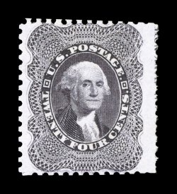 fresh, with rich luxuriant color and a crisp detailed impression#45, 24c Blackish violet reprint, without gum as issued, exceedingly well centered within margins that are so wide that it captures a portion of the imprint at right, remarkably fresh, with rich luxuriant color and a crisp detailed impression on pristine white paper, very fine; one of the very few of the 479 sold that still show part of the imprint in the margin; 1988 PF certificate. (Image) $3,250.00