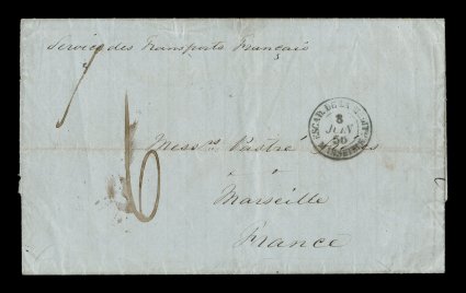 forwarding agents handstamp of William Hadfield, with a sailingBritish Army Post Office at Constantinople, folded letter with red "British Army Post Office/My 29/1856" c,d,s, on back of folded letter to Marseilles, France, with fancy ornate forwarding agent's handstamp of William Hadfield, with a sailing ship in double oval, June 8 Marseilles receivers on front and back, interesting letter from datelined May 27, 1856 from E.G. Forbes at Constantinople detailing his activities in evacuating troops and being ordered to proceed up to Kamiesch for another load of horses, cover with some trivial wear, fine; a cover with both philatelic and historical interest. (imagea) (Image) Est. $400-500