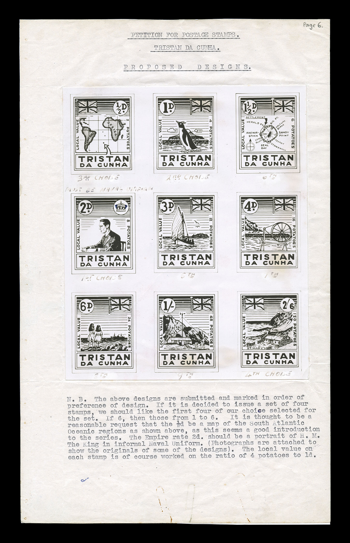 request and on page 6 is a card with the proposed design of nine valu1946 Petition for Postage Stamps and proposed essays, sixteen page typed petition submitted to the Postmaster General of South Africa in Capetown, outlining the reasons for the request and on page 6 is a card with the proposed design of nine values, as well as nine large size hand drawn essays (approximately 94x117mm), the tenth large essay (2d King George VI) has fallen off the pages and is replace by a photocopy, page five contains of block of ten of the 1p "Potato" label, as well as a Ty. VIII cachet and signatures of the island council, what were pages 15 and 16 (photographs) have been remounted on a single page and, for conservation reasons, the staples that bound the petition together have been removed and each page has been neatly and lightly mounted on archival board, fine; this is the finest of only three such petitions in private hands, being the most complete of the three; an indispensable item for a serious Tristan da Cunha collection and would make an outstanding frontispiece for exhibition; ex-Peck. (imagea) (imageb) (imagec) (Image) Est. $15,000-20,000