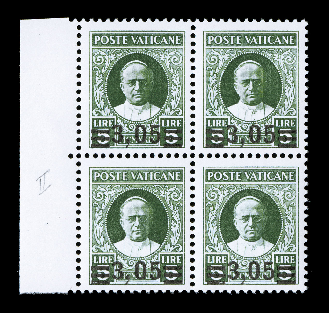 printing, marvelously bright and fresh, o.g., n.h., very fine a rare set of#35-40, 1934 40c-3.70 Surcharges cplt. in matching left sheet-margin blocks of four, the 40c and 1.30L are from the first printing, the other values are from the second printing, marvelously bright and fresh, o.g., n.h., very fine; a rare set of blocks in pristine condition; each stamp is signed A. Diena and accompanied by his 1955 certificate for the set (Sassone #35-40; €16,000). (imagea) (Image) $9,200.00+