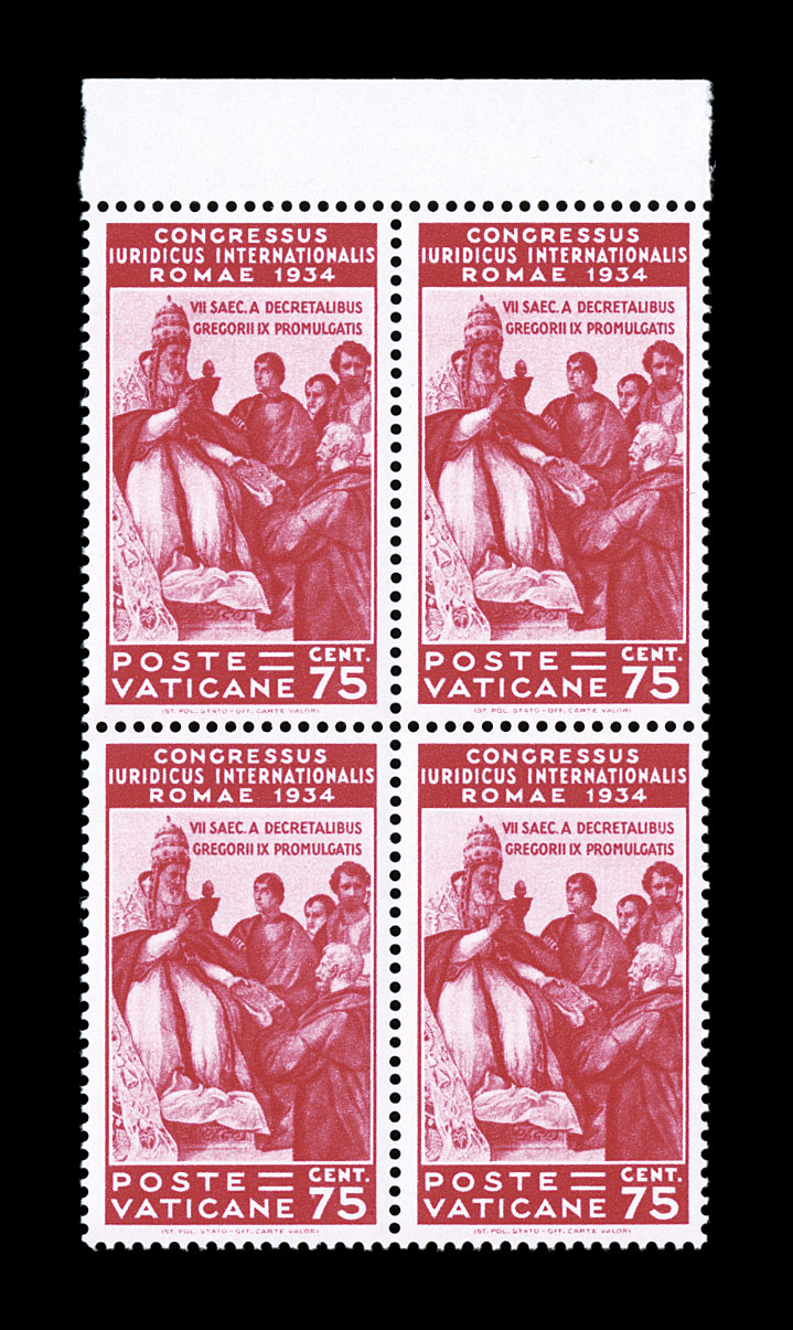 Ç2,000).#47-54 1936 Catholic Press Conference cplt. in blocks of four, brilliant colors, o.g., n.h., 25c with faint gum crease affecting the top two stamps, very fine (Sassone #47-54; €2,000). (Image) $1,200.00+