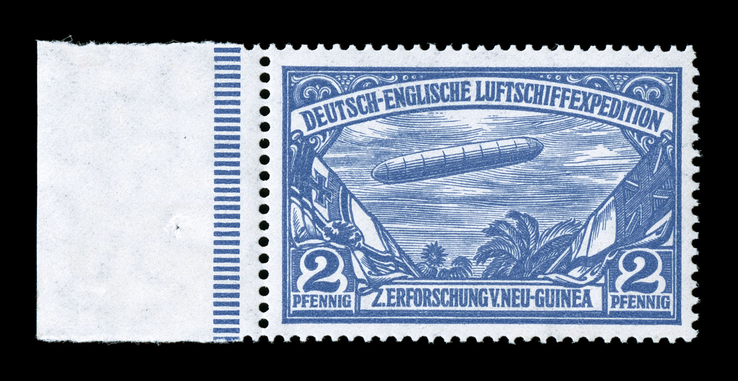 hinged, 2pf never hinged, extremely fine an especially attractive set of th1913 2pf and 1M Unissued New Guinea expedition zeppelins cplt., the 2pf being a left sheet-margin example, both are exceedingly well centered and fresh, o.g., 1M lightly hinged, 2pf never hinged, extremely fine; an especially attractive set of these scarce stamps, which were never put into use due to the cancellation of the planned German-English expedition of New Guinea. (imagea) (Image) Sieger €2,500