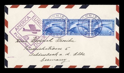 handsome franking of three 2M South America Flight Zeppelin stamps, all welMay 19, 1932 DO-X return flight, especially clean and handsome cover posted on board when air ship was in Newfoundland preparing for the return trip to Germany, bearing a handsome franking of three 2M South America Flight Zeppelin stamps, all well centered and fresh with full perforations, backstamped Berlin on May 27, 1932, extremely fine. (Image) Est. $300-400
