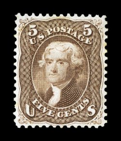 margins, off-center, andor with faults, this particular example, howe#76, 5c Brown, a magnificent mint example of one of the most difficult 19th century stamps to find in truly gem quality, as the vast majority of examples are found with narrow margins, off-center, and/or with faults, this particular example, however, possesses impeccable centering within incredibly large margins for this tightly spaced stamp, strong rich color, full original gum, extremely fine; 1988 PF certificate. (Image) $1,700.00