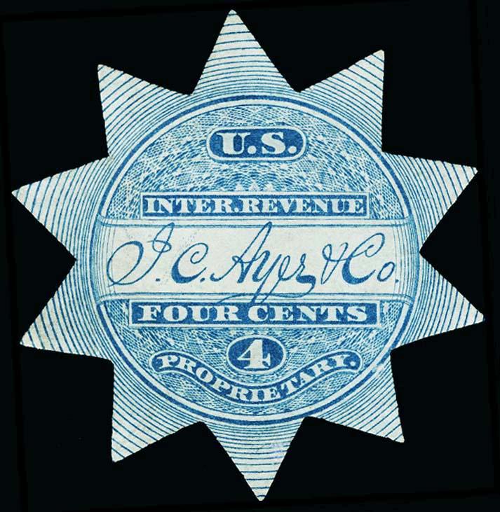 Lot 1064 - PRIVATE DIE MEDICINE (RS9e) 4c Blue, Unused, wonderful sharp color, incredibly well centered for this issue and all the perf tips are intact, quite fresh and Superb Gem, a truly amazing stamp in amazing condition, there are only eight copies recorded with six having faults, the stamp being offered here is considered to be the Finest Known and Private Die Medicine Showpiece item.