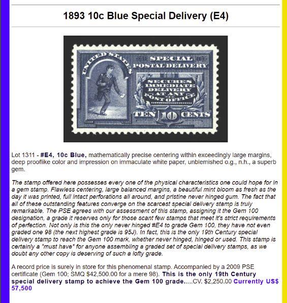 1893 10c Blue Special Delivery (E4) - Top 10 prices paid for examples in N.H., O.G., unused, used, multiples, pairs and on cover.