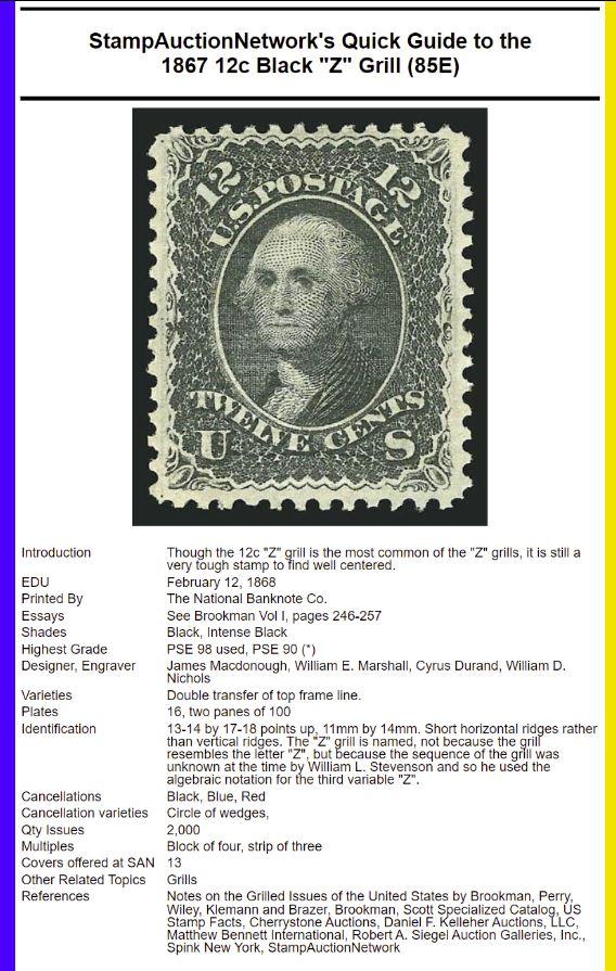 1867 12c Black "Z" Grill (85E) - Digital Handbook to stamps in never hinged, original gum, used, multiples, pairs and on cover.
