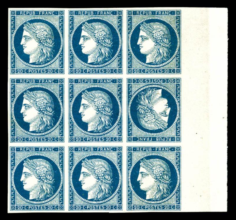 N°8c, Non émis, 20c bleu sur jaunâtre: tête-bêche tenant à normaux dans un bloc de neuf bord de feuille latéral avec fond de sûreté. GRANDE RARETE DE LA PHILATELIE FRANCAISE. SUPERBE. R.R.R. (signé Calves/certificats) Qualité: (*)....