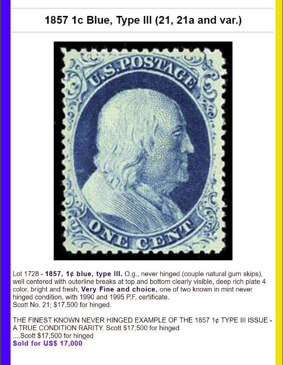 1857 1c Blue, Type III and vars - Top 10 prices paid for examples in N.H., O.G., unused, used, multiples, pairs and on cover.