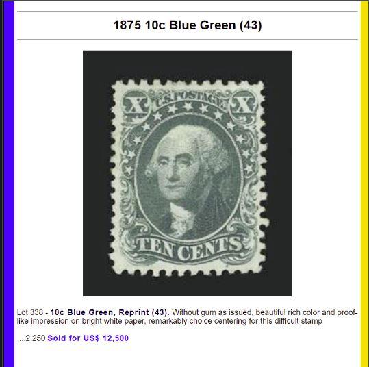 1875 10c Blue Green (43) - Top 10 prices paid for examples in N.H., O.G., unused, used, multiples, pairs and on cover.
