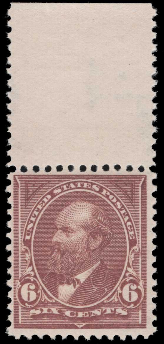 Lot 9049 - UNITED STATES 1893-1907 1895, 6c DULL BROWN DOUBLE LINE WMK MINT NEVER HINGED, #271, top selvage single, fine-very fine, cat. $340.00....US$150