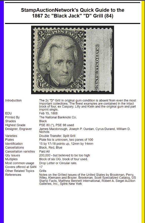 1867 2c "Black Jack" "D" Grill (84) - Digital Handbook to stamps in never hinged, original gum, used, multiples, pairs and on cover.