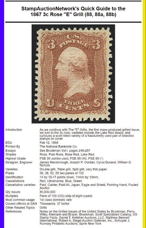 1867 3c Rose "E" Grill (88, 88a, 88b) - Digital Handbook to stamps in never hinged, original gum, used, multiples, pairs and on cover.