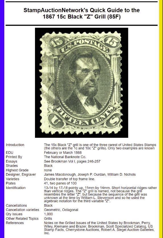 1867 15c Black "Z" Grill (85F) - Digital Handbook to stamps in never hinged, original gum, used, multiples, pairs and on cover.