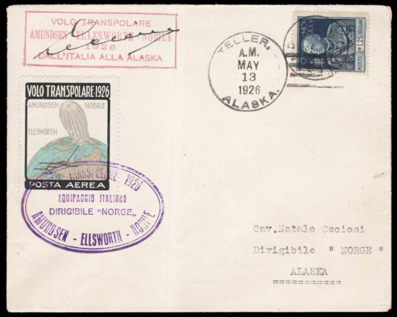 Lot 9158 - Zeppelin Flight Covers ZEPPELIN COVER - 1926 FIRST TRANS-POLAR NORTH POLE FLIGHT OF THE DIRIGIBLE "NORGE" COVER ADDRESSED TO ALASKA, Italy 1.25l blue tied by Alesund and Teller, Alaska d.s., expedition label tied by purple expedition cachet, violet rectangular-box-4-line cachet "VOLO TRANSPOLARE / AMUNDSEN - ELLSWORTH - NOBILE / 1926 / DALL'ITALIA ALLA/ALASKA" with crew member signature, fresh and very fine, very scarce, AAMC #PP47d....US$1,000