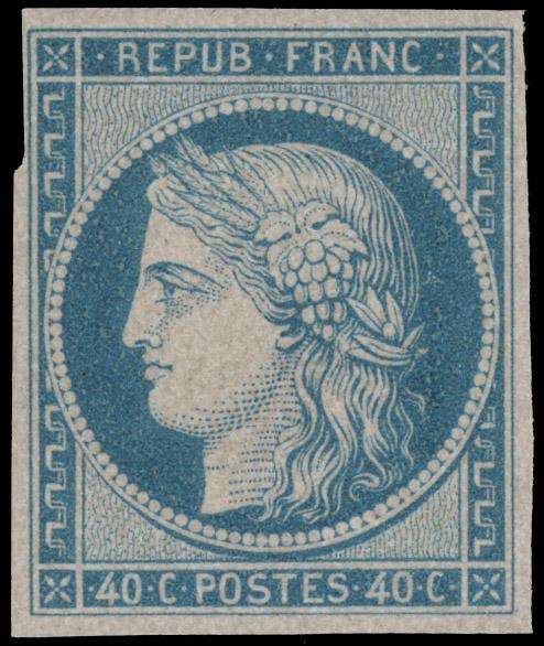 FRANCE, 1849, 40c BLUE (UNISSUED) UNUSED, #7 var., full margins, without gum as issued, very fine, rare, with 2022 Pascal Scheller cert., listed in footnote in Scott at $28,000.00, Yvert #5B @ €16,000.00. both values for no gum....US$3,500