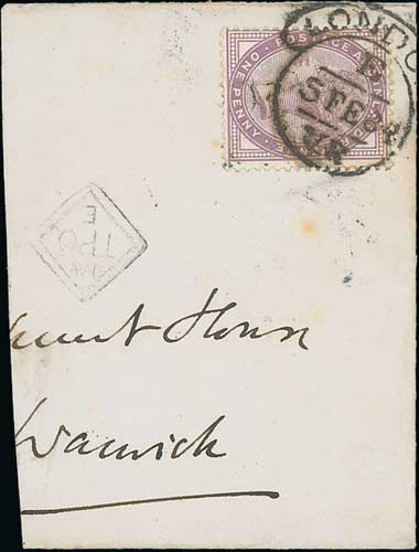 283 1883-84 Long covers all with commercial company names and addresses on the flap, franked 1d (2) or 1½d, all with V.R hooded circle datestamps, code "B". Unusual uses of this datestamp on mail with no official or royal origin. (3).