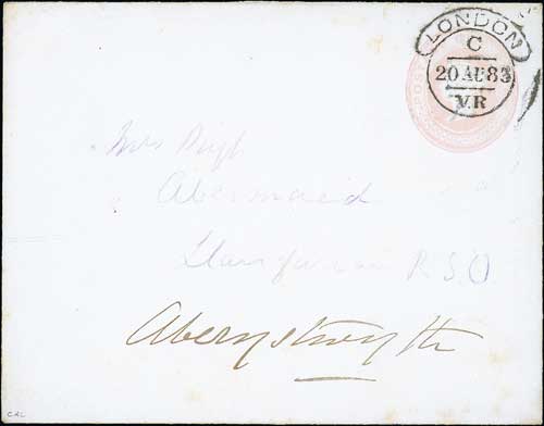 281 image1883 (Aug 20) 1d Pink envelope to Wales with V.R hooded circle datestamp code "C", unusual on postal stationery, exceptionally fine quality. Photo on Page 38. (Image1)