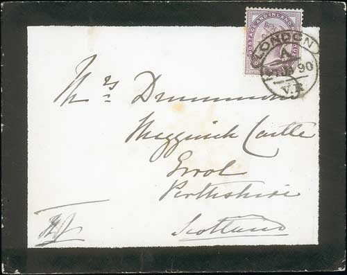 289 image1890 (Jan 27) Mourning cover addressed in Queen Victoria's handwriting to "Mrs Drummond, Magginch Castle, Errol, Perthshire, Scotland", signed "The Q" in the corner, a 1d lilac cancelled by VR hooded circle datestamp code "A", flap missing, otherwise a fine cover from The Queen. Photo on Page 38. (Image1)