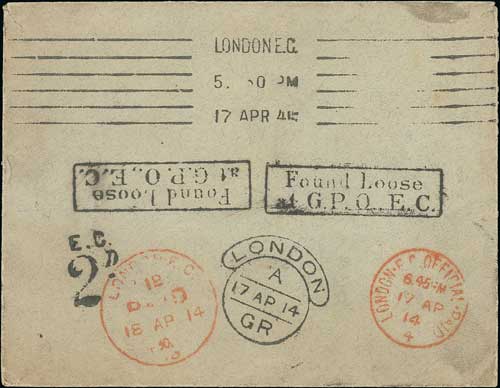 291 image1914 (Apr 17/18) Cover with proof impressions of seven London E.C cancels or handstamps comprising London E.C Krag machine, 1d Paid and Official Paid datestamps in red, "E.C / 2d" charge mark and boxed "Found Loose / at G.P.O., E.C" (2 strikes), and "LONDON / G.R" hooded circle datestamp code "A". This datestamp is recorded in the E.C proof impression book dated 9 August 1910 "for use on The Kings mail" but is not recorded on a postally used cover, this proof strike the only example known to us. Photo on Page 38. (Image1)