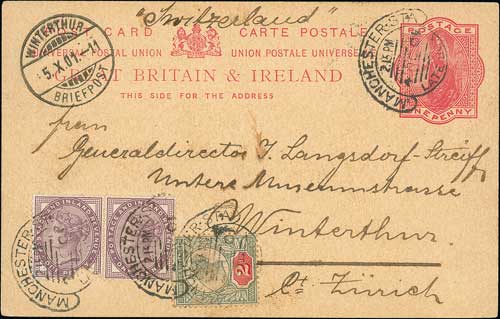 296 imageManchester Sta. 1901 (Oct 4) 1d postcard franked 1d pair (one with fault) and 2d, to Switzerland, the four stamps each cancelled by Manchester Sta. Late Box hooded circle datestamp with 2.15PM time, an unusual 4d late fee rate. Photo on Page 38. (Image1)