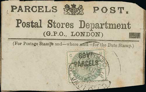 300 imageG.P.O London. 1884 (June 3) Postal Stores Department first type "Parcels Post" label franked 9d green Govt. Parcels overprint cancelled by the "G.P.O LONDON / PARCELS POST / DEPOT" hooded circle, code "A" above and below the date. Also similar cancel with codes "C" and "E" on a single 1/- orange-brown Govt. Parcels stamp, and 1897 Postal Stores Department parcel label with 6d purple Govt. Parcels tied by the second type "Parcel Post" hooded circle with lower code letter removed. The 1897 label with several faults, 1884 label a little clipped at right corners but otherwise fine and very scarce. (3). Photo on Page 42. (Image1)