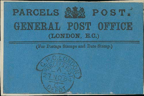 301 imageG.P.O London. 1883-86 "G.P.O LONDON / PARCELS POST / DEPOT" hooded circles on a Found Open and Officially Secured label (28 NO 83), blue first type Parcels Post label (27 NO 84), white second type Parcel Post label (11 DE 84) and on single stamps (5), code letters above and below the date. The Parcels Post was renamed the Parcel Post in 1884 after little more than a year with new parcel labels and cancels issued, this Parcels Post cancel continuing in use until at least Nov. 1886. (8). Photo on Page 42. (Image1)