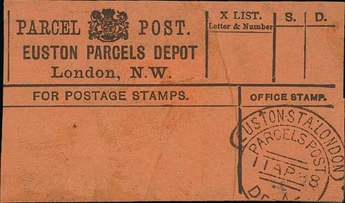 305 imageEuston Station. 1888 (Apr 1) Euston Parcels Depot orange Parcel Post label, for parcels despatched on the London to Brighton Parcel Coach (therefore without any fees payable to the railway companies) with the very scarce "EUSTON STA. LONDON / PARCELS POST / DEPOT" hooded circle (issued in 1883, four examples recorded in 1884-88). Very scarce, the datestamp used four years after the service was redesignated the Parcel Post. Photo on Page 42. (Image1)