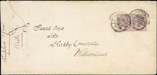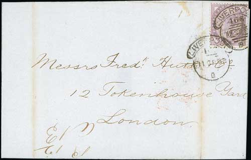 321 imageVictoria Street. 1883 (Sep 20/21) Cover and card, also three pieces, all with the very scarce "V·LIVERPOOL·S" hooded circle cancel, only recorded 20 Sept. 1883 - 4 Jan. 1884. (5). Photo on Page 38. (Image1)