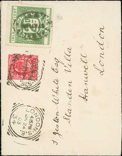 478 imageIsle of Wight Railway. 1903 (Jan 24) Cover to London franked KEVII 1d + 2d railway stamp both cancelled oval "SHANKLIN / STATION / I.W RY", the 1d stamp cancelled upon arrival with London S.E squared circle, Paddington backstamp. Also a single KEVII 6d with oval Sandown Station I.W Ry cancel. A fine and scarce commercial cover. Photo on Page 62. (Image1)