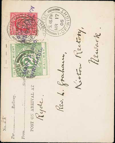 479 imageIsle of Wight Railway. 1906 (Mar 17) Cover to Rev. Graham in Newark "to be posted on arrival at Ryde", bearing KEVII 1d + 2d railway stamp both cancelled by violet "MAR 17 1906" and "WROXALL", and by Ryde datestamps, backstamped at Newark, fine and scarce. Photo on Page 62. (Image1)