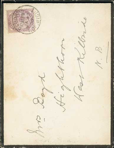 487 image1899 (Jan 10) Mourning cover with printed Osborne flap, addressed to Mrs Boyd in West Kilbride, a 1d lilac cancelled by "OSBORNE / I • OF • WIGHT" c.d.s. The enclosed letter, written on Osborne notepaper by Archibald Boyd to his mother, tells of his investiture with the K.C.B and audience of over half an hour with The Queen. Photo on Page 62. (Image1)