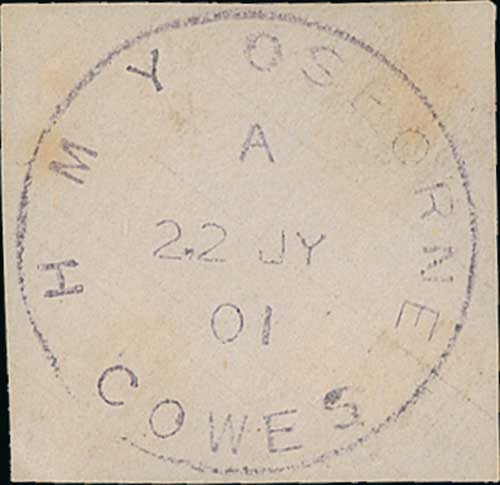 489 image1901 (July 22) Piece with "HMY OSBORNE / COWES" skeleton datestamp in violet, issued for use at the Royal Regatta, only recorded as proof strikes on a very few pieces. Photo on Page 10. (Image1)