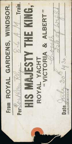 491 image1930 (July 30) Cloth tie-on parcel tag originally attached to a parcel sent by train to The King on the royal yacht, partly printed address completed in pencil "From ROYAL GARDENS, WINDSOR, Per Southern Rly 8.6 A.M Train, HIS MAJESTY THE KING, ROYAL YACHT "VICTORIA & ALBERT", Cowes, Isle of Wight", an exceptional item, the first example we have seen. Photo on Page 62. (Image1)