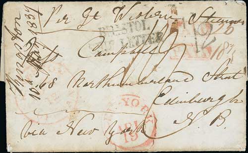 Canada - Freight Money Letter. 1839 (Apr. 12) Entire letter from Kingston to Edinburgh sent via New York as a freight money letter endorsed "Per Gt Western Steamer". Prepaid 18¾c internal U.S postage and