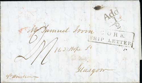 USA. 1837 (July 24) Entire letter from New York to Glasgow by the steamer "Andrew" with fine boxed "CORK / SHIP LETTER" (S4), Cork and Dublin backstamps, "Add / ½" applied in Dublin, very fine. Photo on