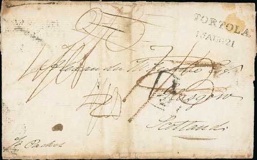 Antigua. 1823 (Apr 8) Entire letter from Antigua to Edinburgh handstamped with a fine "PORT GLASGOW / SHIP LETTER" (S5). The writer has just arrived in Antigua after a six week voyage from Gravesend, and leaves for Montserrat the following day. An