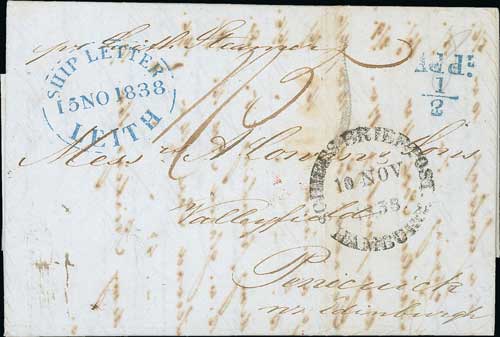 Germany. 1838 (Nov 10) Entire letter from Hamburg to Penicuick endorsed "per Leith Steamer", Schiffs Briefpost Hamburg datestamp and superb blue oval "SHIP LETTER / 15 No 1838 / LEITH (S6) and matching